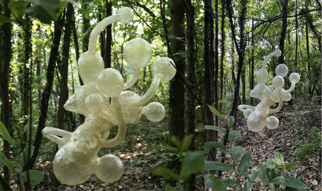 L’opera è parte da una riflessione su una delle creature più antiche e misteriose che abitano la biosfera: il micelio. Questo lavoro ne esalta e glorifica la bellezza, creando una creatura ibrida, un organismo che resisterà idealmente anche al cambiamento climatico.