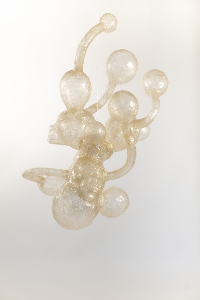 Mycelia Creatura si staglia in centro alla stanza, è organica cresce e si espande nella mente, assorbe e riflette la luce. Abita l’umano e lo avvolge inglobandolo.