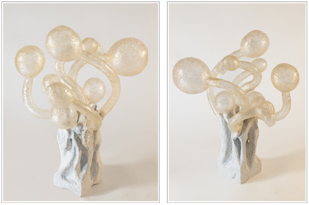 Mycelia Forza Vitale parte da una base minerale di marmo di Botticino che plasmato dalla forza vitale del materiale organico, lo eleva, in un essere ibrido. La tensione della forza evolutiva della natura è il motore dell’opera che rappresenta il mutamento necessario ad evitare una possibile estinzione dell’umano.