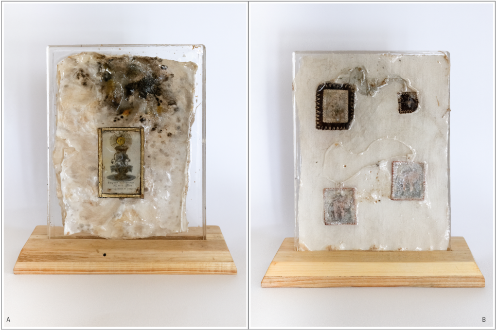 A. Opera: 31 cm x 24 cm, legno, resina epossidica, ostia 2023 B. Opera: 31 cm x 24 cm, legno, resina epossidica, cotone 2023